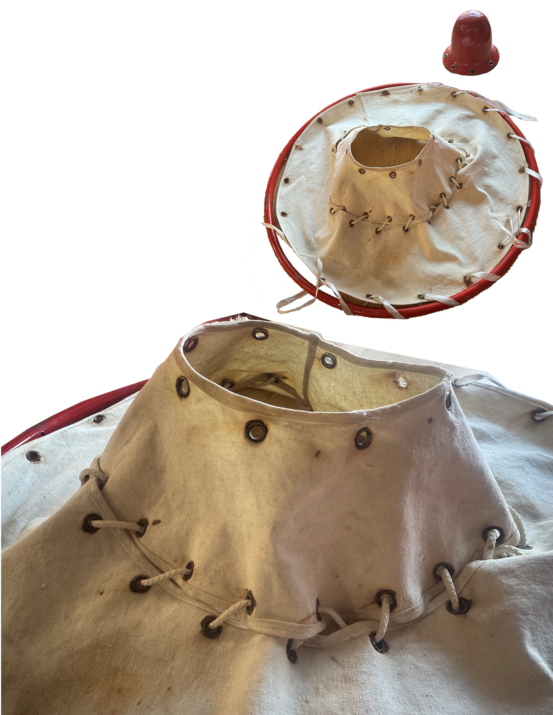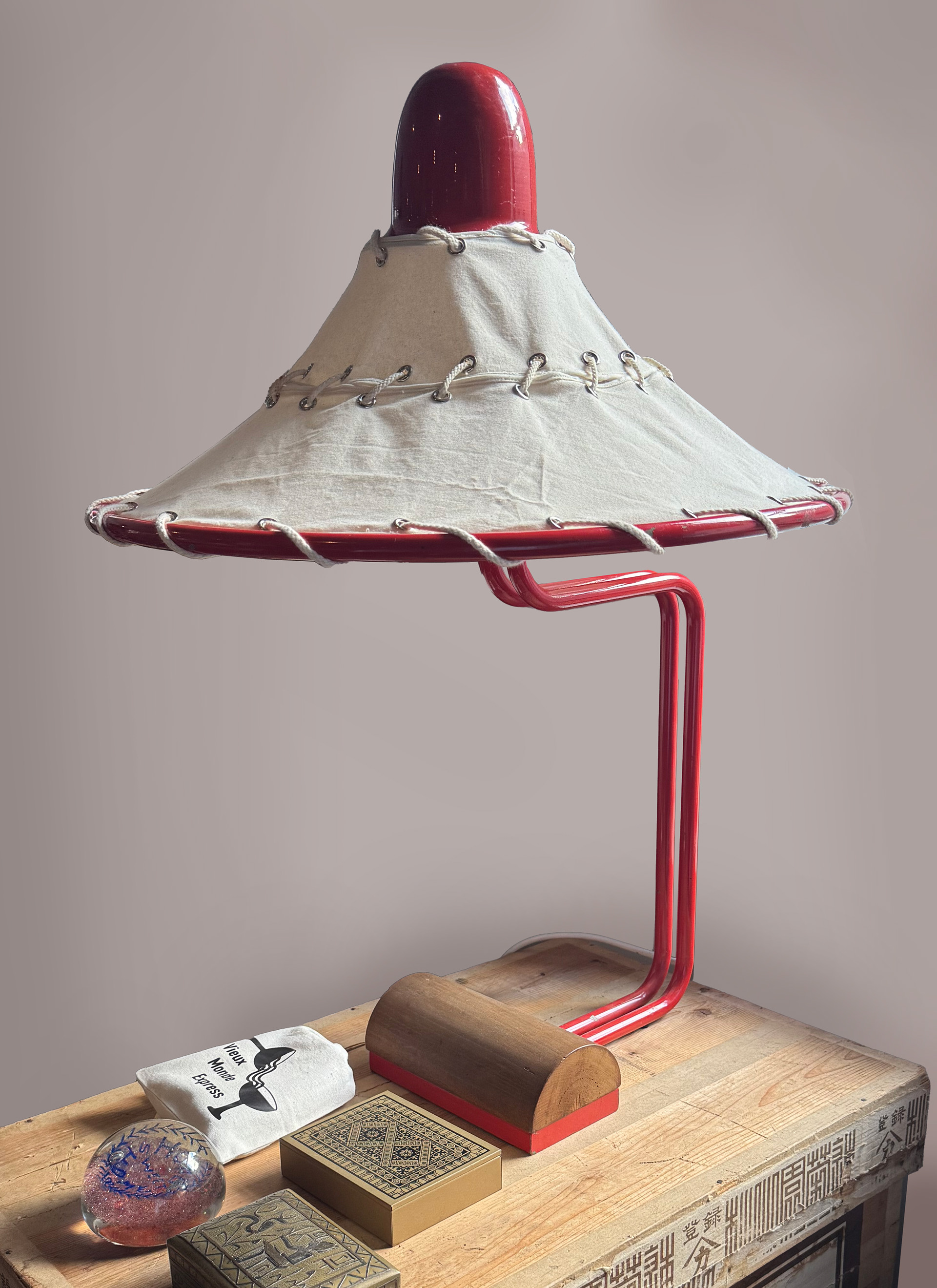 This quirky 70s design features a two tier linen shade lined with several grommets, which after half a century of life needed restoring. Creating a pattern from the deconstructed old shade and matching the existing grommet sizes, color, and placement yielded a faithful recreation of the original design.