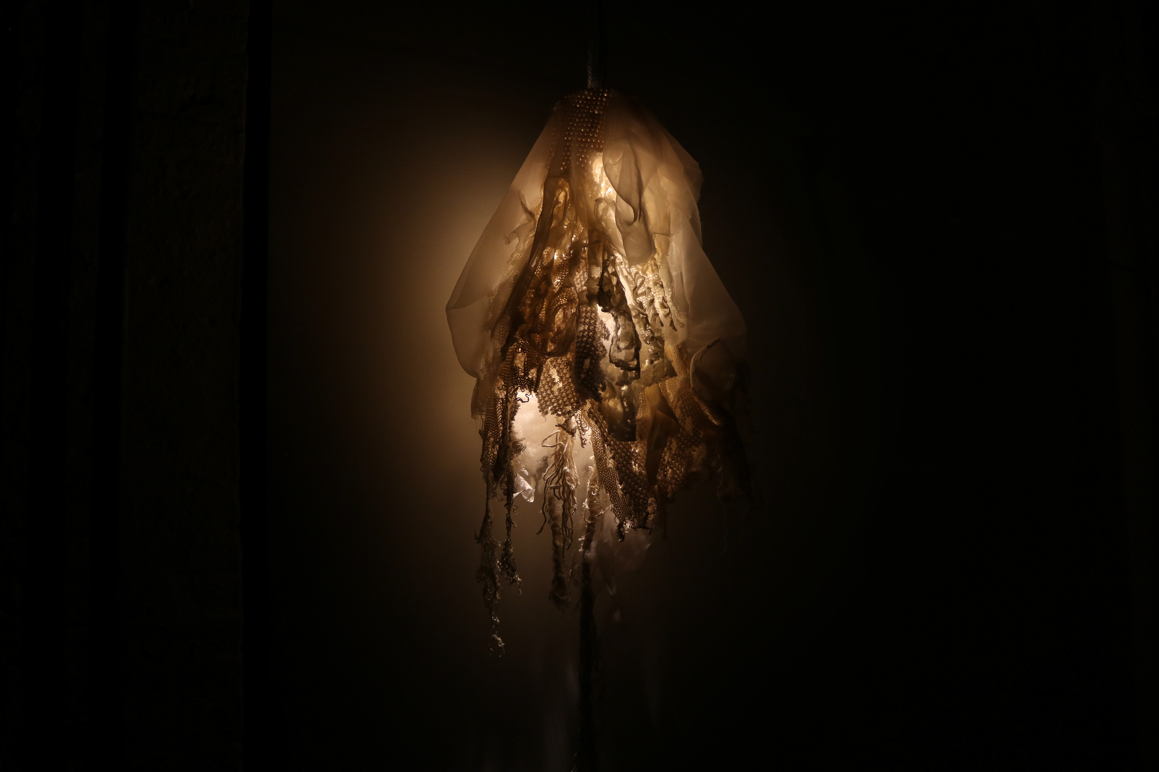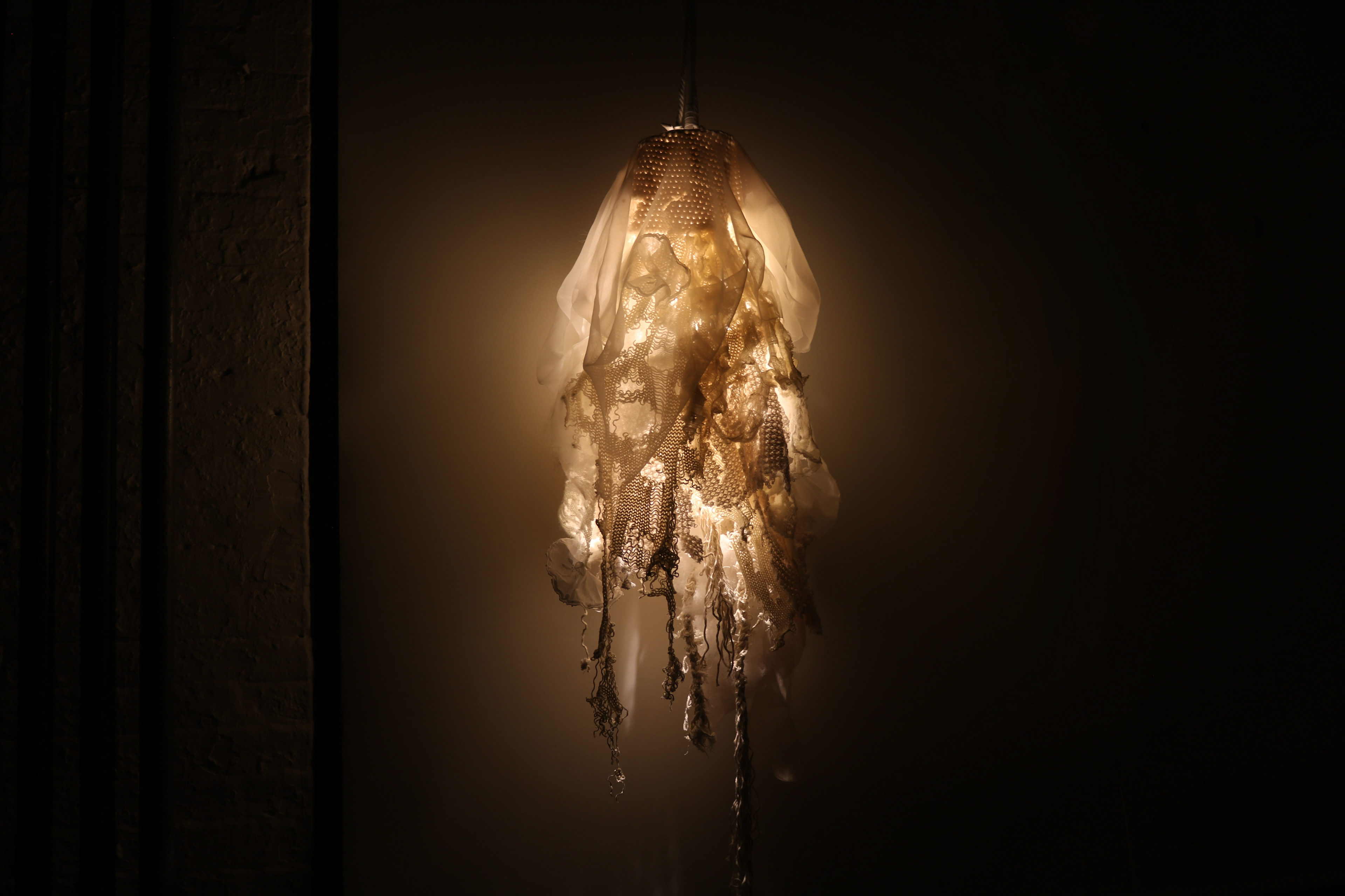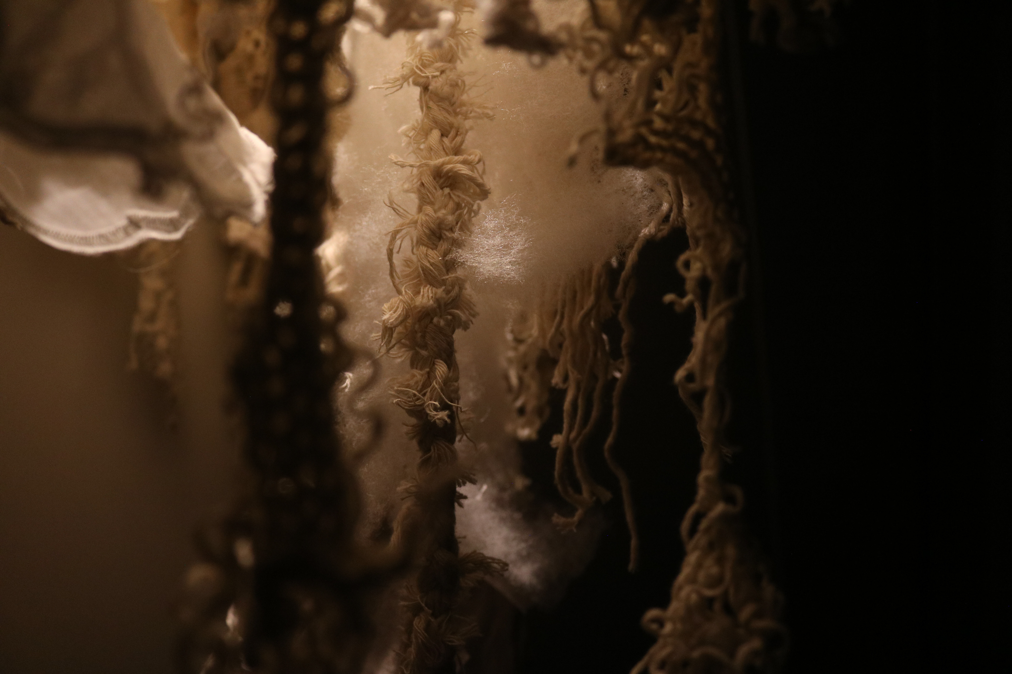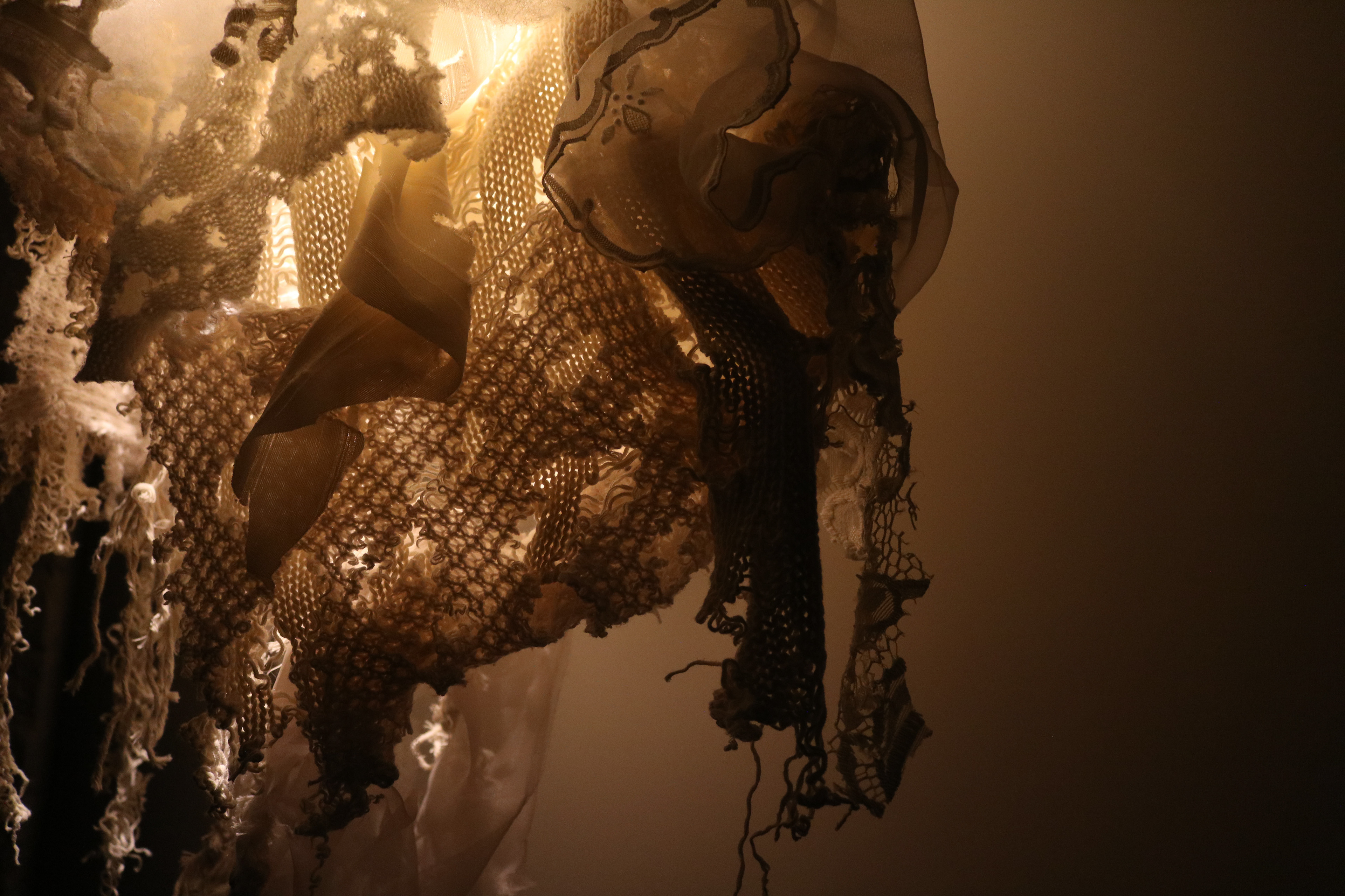 Angelic Decay portrays the beauty and importance of decay as part of the circle of life. The soft lighting and white shades of fabric represent a heavenly, angelic quality, while the secondhand textile material and variety of distressing methods represent the both destruction and renewal brought about by decay.