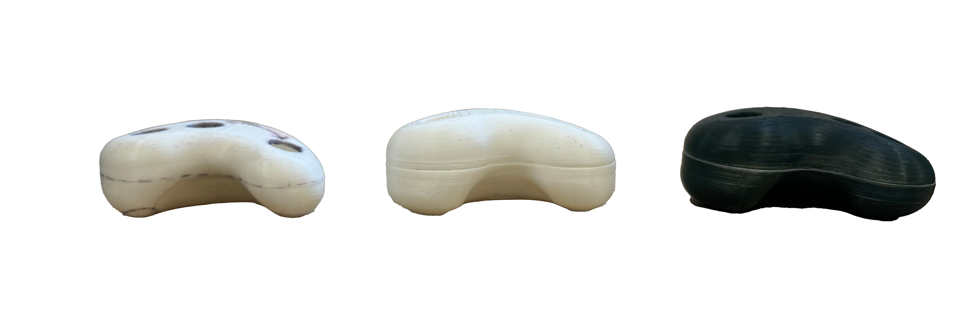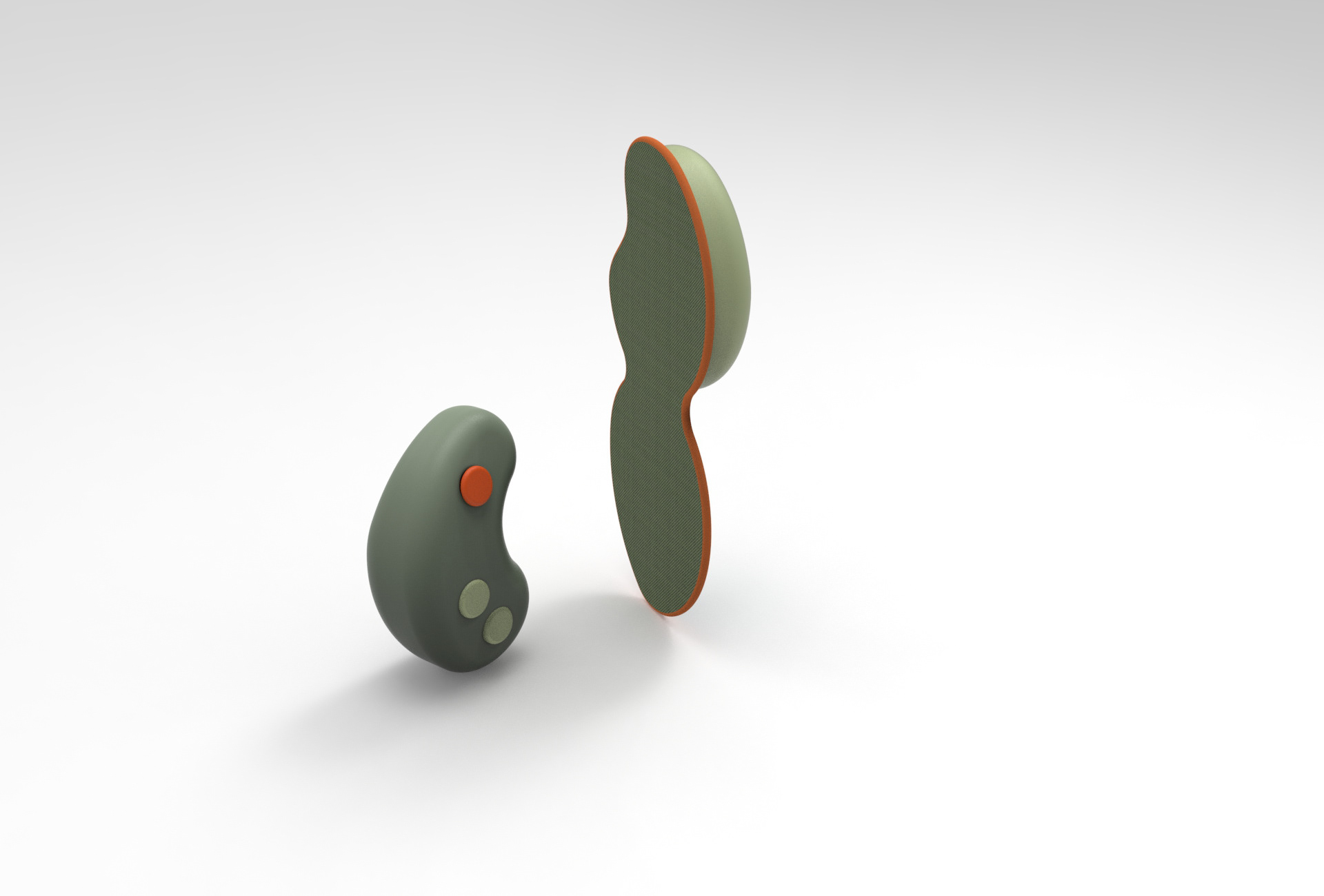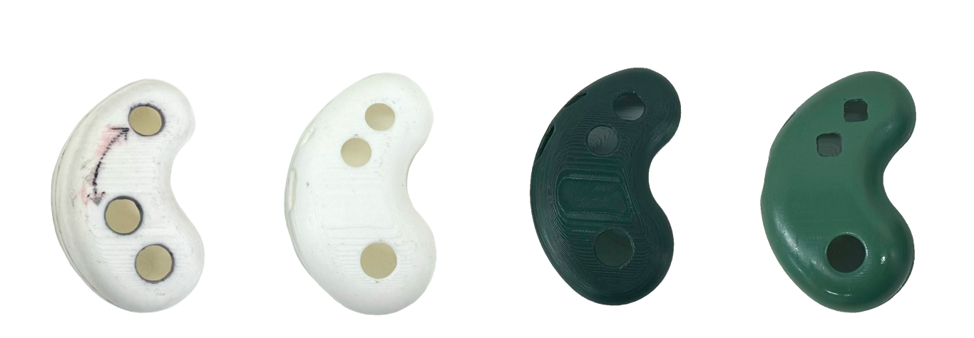 When examining the clip form, I experimented with symmetrical and asymmetrical mirrored halves as well as different scales. To increase both aesthetic appeal and differentiation between the top and bottom of the clip, I created an asymmetrical design that closely mimicked the shape of the hard electronic housing. For the fidget, it took multiple iterations to model an ergonomic shape that could be used in both hands and more widely understood by users.