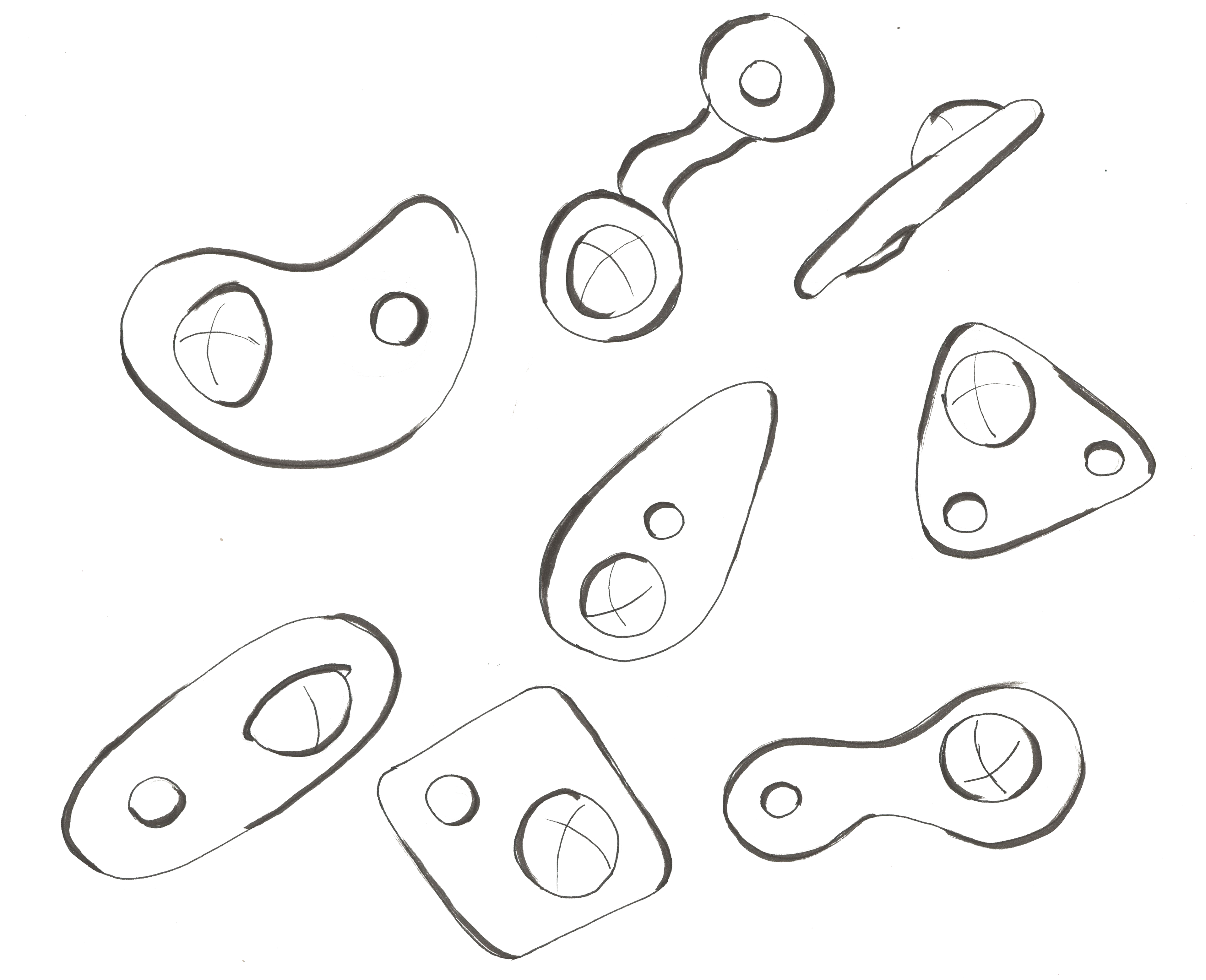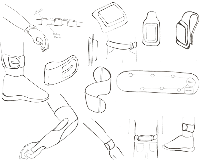 After researching sensory devices and fidgets, I started to sketch possible solutions for both the wearable device and the handheld fidget, exploring different attachment types, materials, and forms.