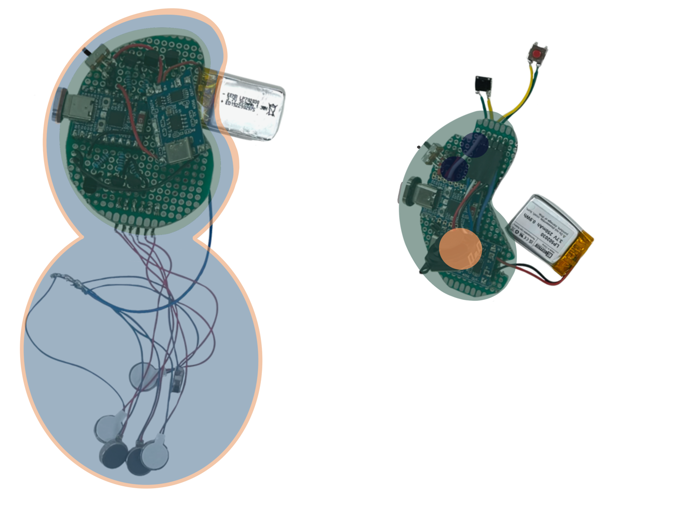 In order to create a fully working prototype, each component required a CPU, Battery, Charging Port, control inputs, power switches, and vibration motors. Features of this layout include a magnetic charging port to avoid physically stressing the prototype, custom cut boards for a compact circuit layout, and variated motor heights to avoid wire bulk within the wearable.