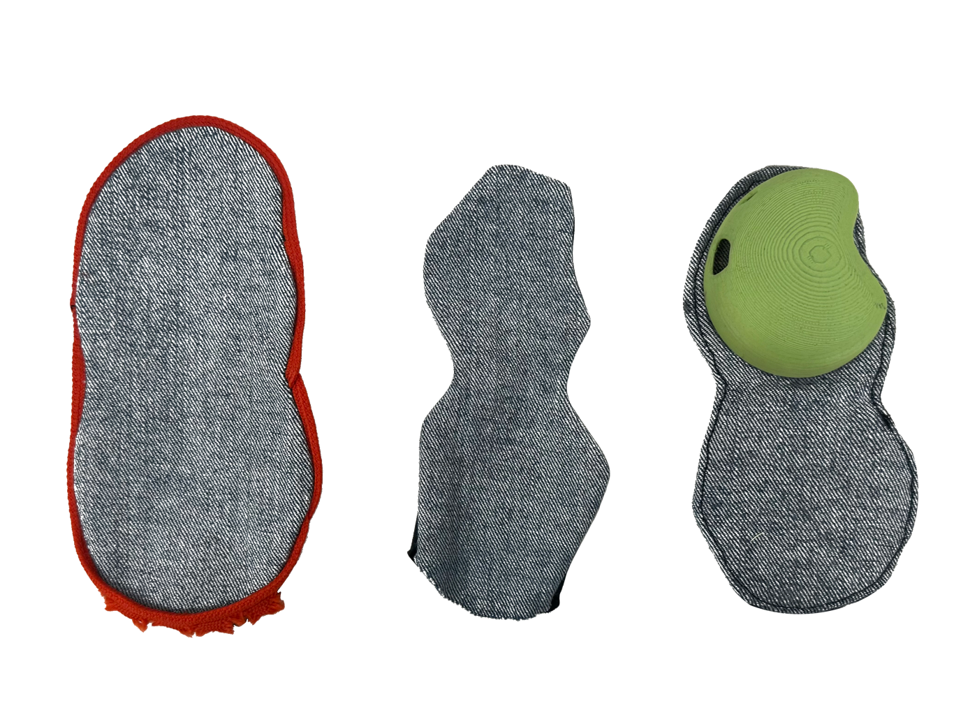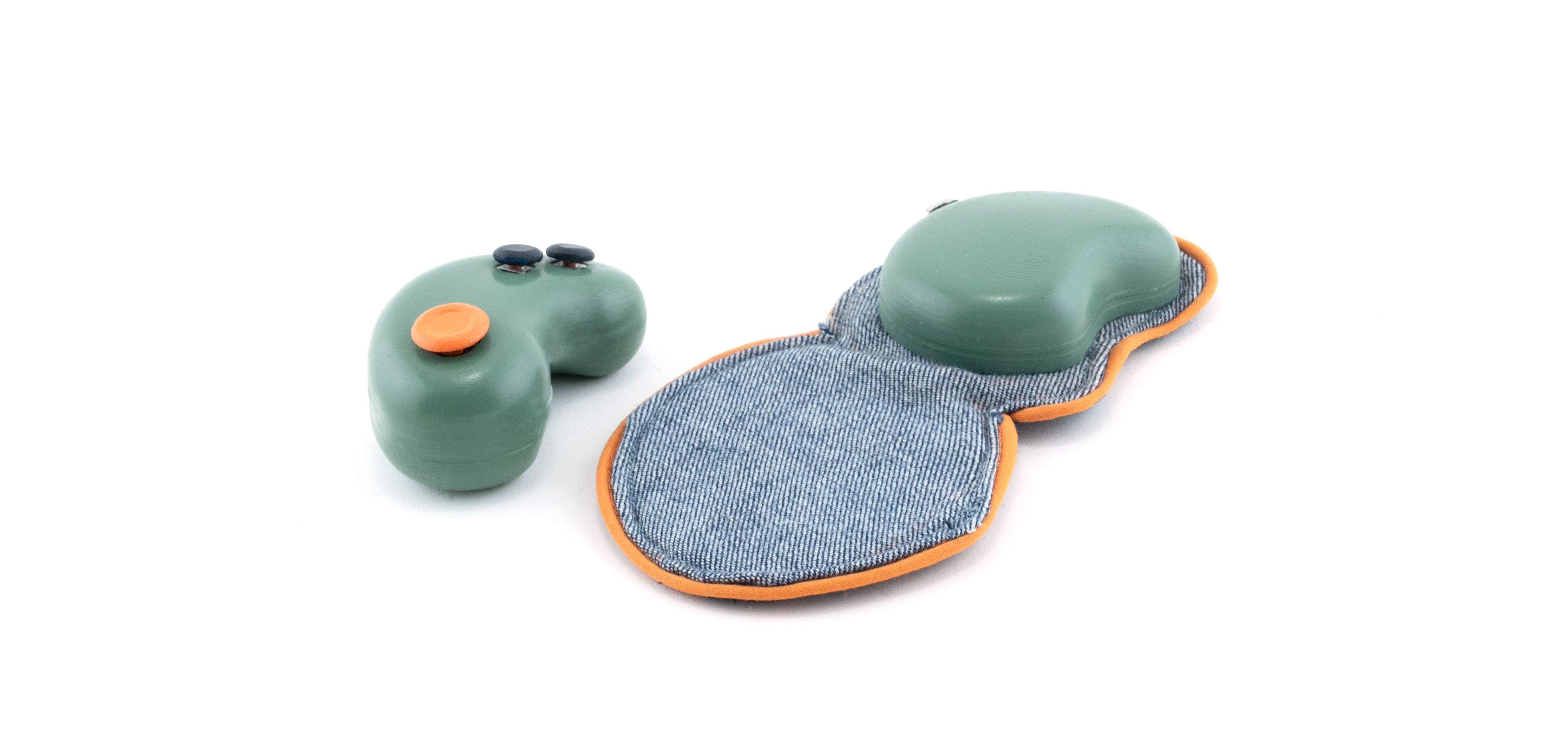 When considering what color scheme compliments this design, I researched what colors neurodivergent people prefer. That led me to pursue a bio-based color scheme with a brighter accent color. This moodboard inspired the final selections. For materials, I researched and tested multiple fabrics for their compatibility with sensory issues. The final textiles are a denim exterior, a soft cotton twill interior, and a smooth plastic finish for the fidget and electronic housing.