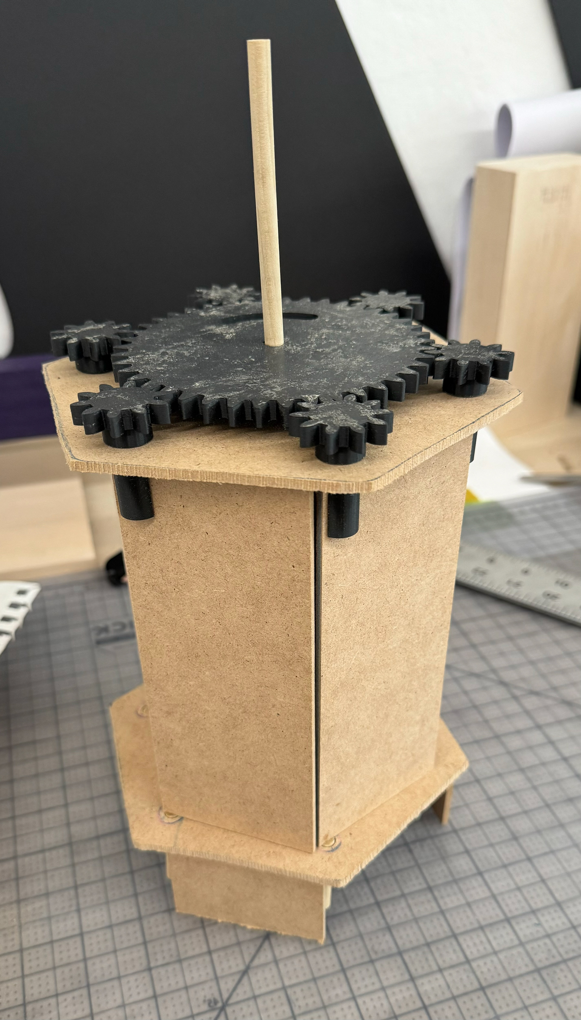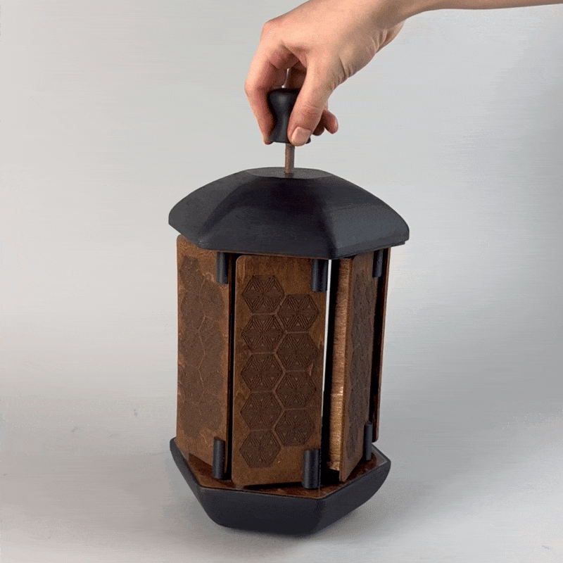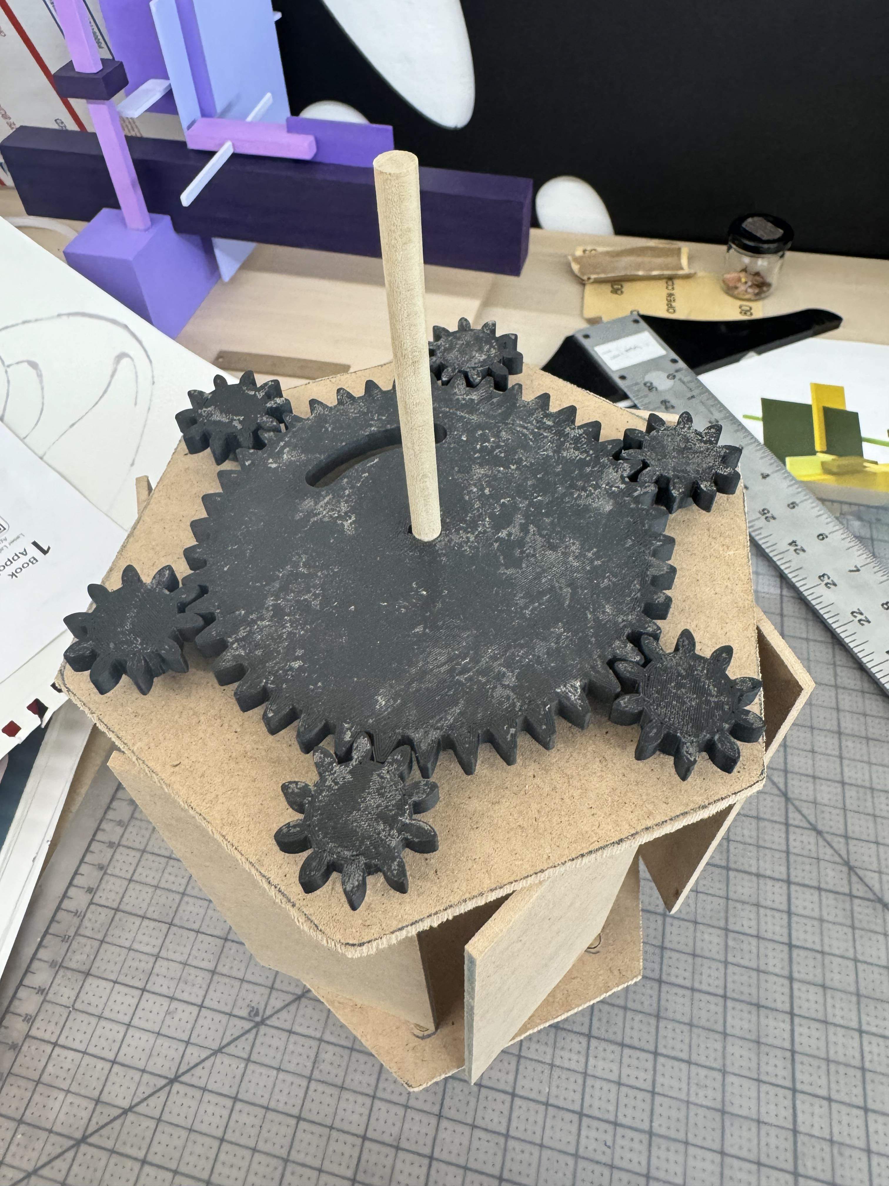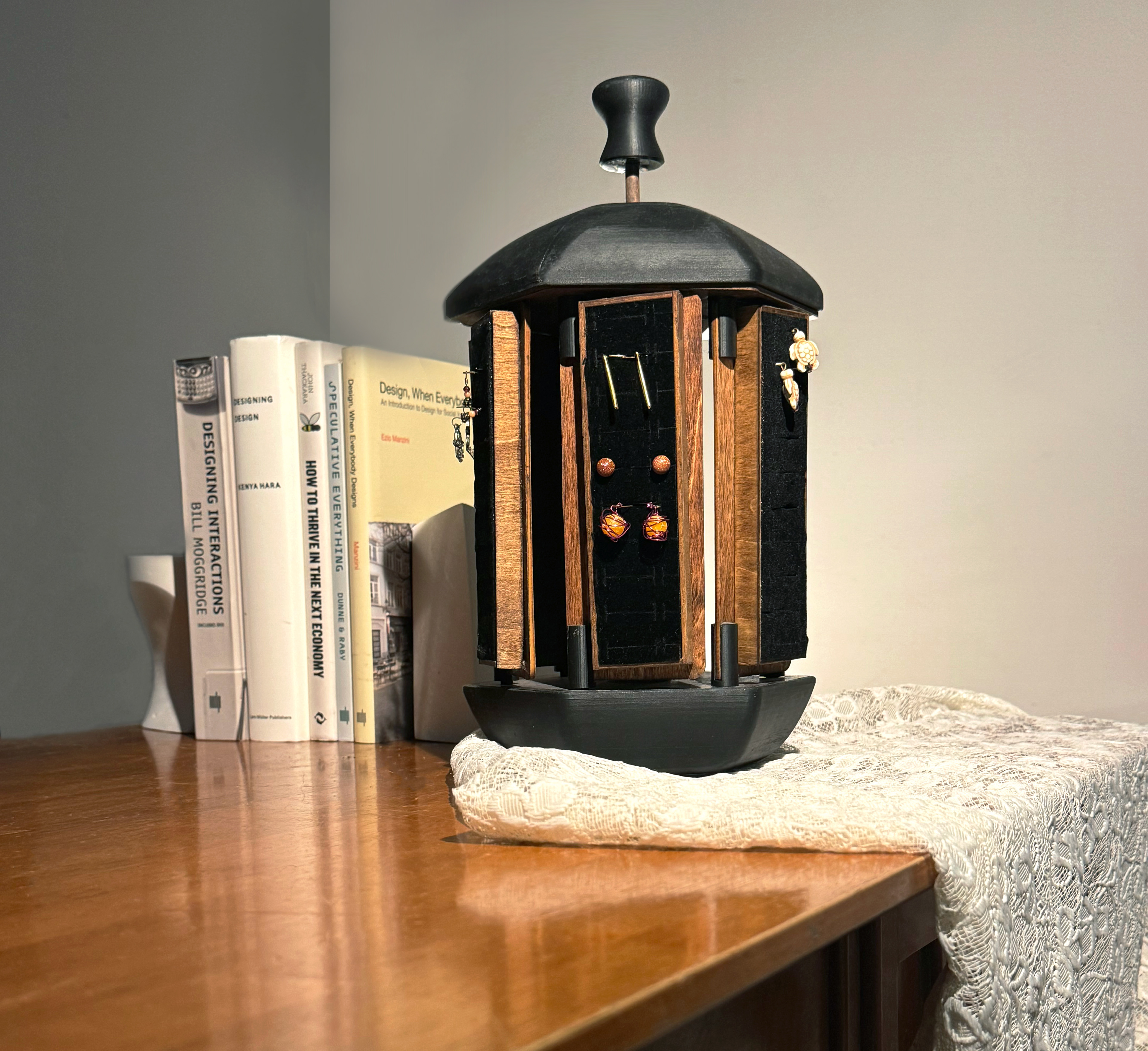 Based on vintage lipstick/cigar carousels, this design offers a dynamic and unique way to store rings, earrings, and necklaces. The mechanism is made up of seven gears and produced through 3D Printing and Laser Cutting.
